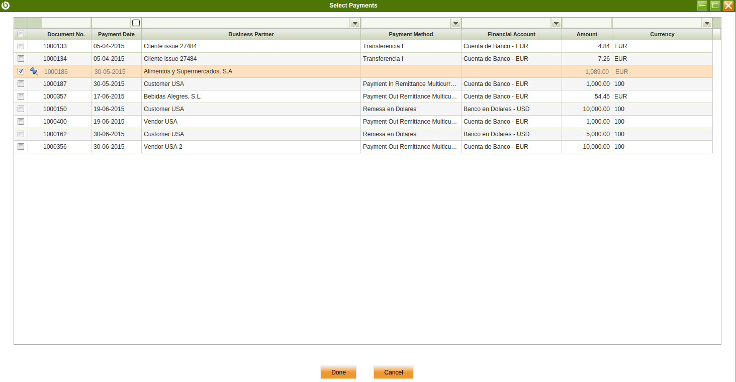 | Steps To Reproduce | Install Remittance module attached and apply Remittance dataset to F&B España in the enterprise module management window. Navigate to payment method window and create a new one with below setup: Name "Payment Out Remittance Multicurrency" Payment Out Allowed = Yes Make Payments in multiple currencies = Yes Execution type = Automatic Execution Process = In remittance Deferred=Yes Go to Remittance type window and create a new one with below setup: Name = Payment Out Remittance Multicurrency Payment method = Payment Out Remittance Multicurrency Posting allowed = Yes Go to Financial Account window and search by "Cuenta de Banco", go to Payment Method tab and select there "Payment Out Remittance Multicurrency" payment method. Go to price list and create a new one (purchase) in USD. Price List version valid from 01-01-2014, price List schema = Esquema de tarificación. Go to "Product Price" tab and select a product (i.e. Agua sin Gas 1L), and enter 100.00 as unit price/list price Go to BP window and create a new vendor/supplier named i.e Vendor USA. Go to Vendor/Creditor tab and enter below setup: Purchase price List: Purchase price list in USD PO Payment Method: Payment Out Remittance Multicurrency PO Payment Terms: Treinta días PO Financial Account = Cuenta de Banco Go to Location tab and enter United States country address. Navigate to Purchase Invoice window. Create a new record for F&B España with below setup: Business Partner: Vendor USA 2 Invoice Date = Accounting Date = 21-05-2015 Go to lines and create one line with below setup: Agua sin Gas 1L, 150 units. Complete and Post the invoice. (Purchase Invoice 100000654) Total Gross Amount = 15000.00 USD Navigate to Purchase Invoice window. Select purchase invoice 1000000654 Click on Add Payment button and enter below data: Payment Date = 30-06-2015 Edit 20-07-2015 expected date line, and change Amount field to 1000.00, therefore Actual Payment field changes to 10000.00 USD Select Process Made Payment option in ""Action Regarding Document"" field Press Done. Created Payment 1000356 Navigate to Remittance window Create a new one by entering below data: Remittance Type = Payment Out Remittance Multicurrency Transaction date = Expected date = 30/06/2015 Name = Payment Out Remittance 1 Multicurrency Save Click on Select Payments button. Remove by default filter in the ""Select Payments"" window Select any payment there and realize that USD payments currency column changes to "100". See image attached. | |||||||
