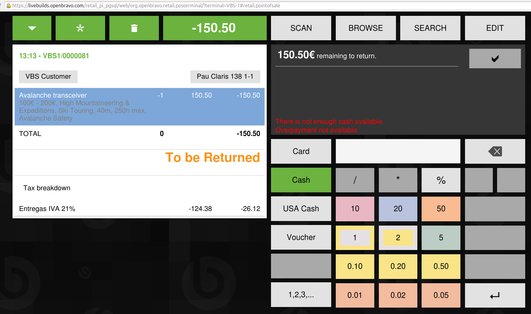 Both the "There is not enough cash available" and "Overpayment not available" messages are shown, even if there is enough cash in the terminal.