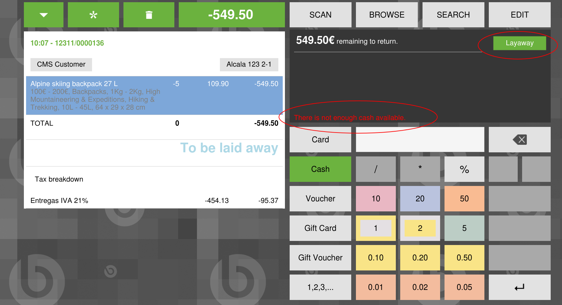 | Steps To Reproduce | 0-Login POS and complete a cashup keeping nothing to clean the instance. 1-In a new receipt, add 5x "Alpine skiing backpack 27L". 2-In dropdown menu, click "Layaway this Receipt". 3-Click in "Alpine skiing backpack 27L" product line and click in "Return Line". 4-Click in Total Amount button and you will see "There is not enough cash available" appears. That message is not necessary to be shown due to it can confuse the user. (If you click "Layaway" button at that moment, you can check a message warning that it not possible to layaway a sale with returns). | |||||||||||