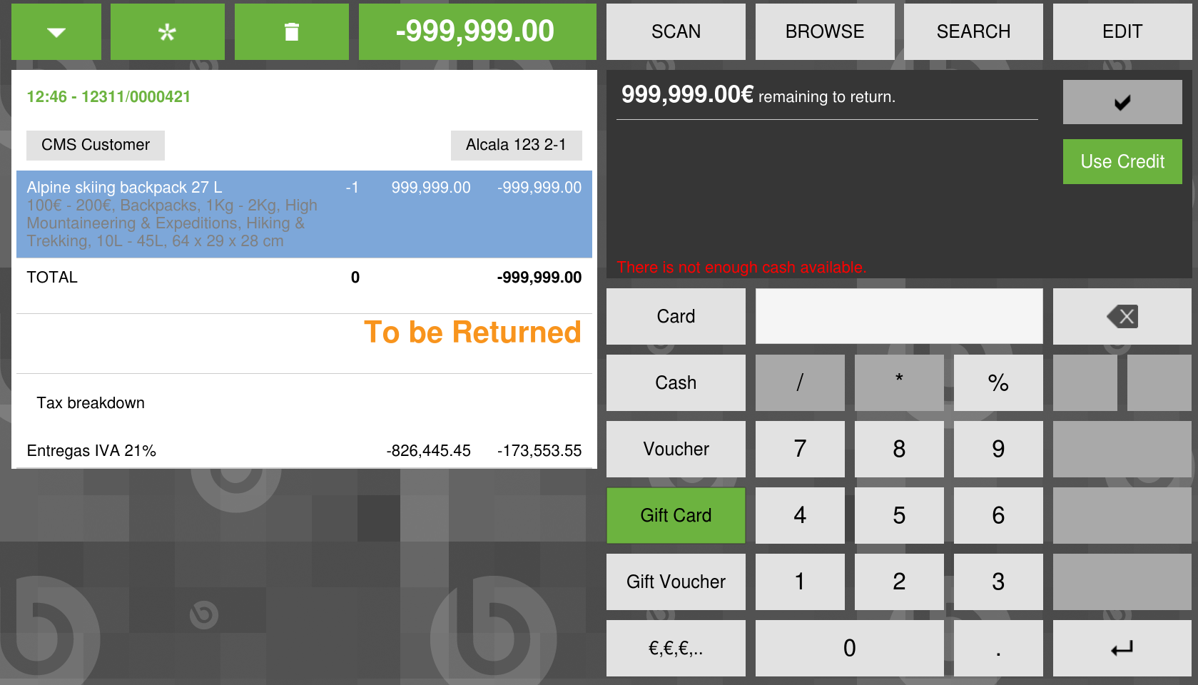| Steps To Reproduce | 0-With Gift Cards & Vouchers installed and a Gift Card created to use it later, login POS as vallblanca. 1-Complete a cashup keeping no money. 2-Create a new receipt and add 1x "Alpine skiing backpack 27L". 3-In dropdown menu, click "Return this Receipt" option. 3-Click Total Amount button. Due to there is not enough cash to return to the client, it is shown "There is not enough cash available". 4-Now, click Gift Card payment method. DEFECT: It is still shown "There is not enough cash available". This flow is different to others like selecting Card payment method. | |||||||||||