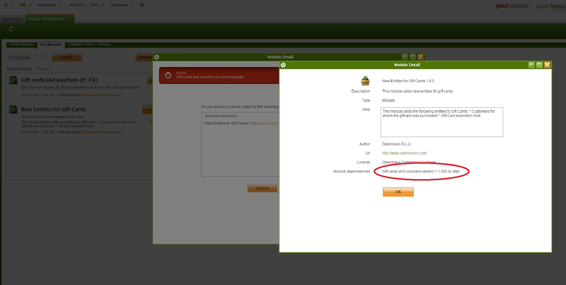 | Description | It is shown a wrong message when user is installing a new module through "Module Management" window, "Add Modules" tab under some circumstances. This situation happens if the module that is going to be installed depends on other module and this other module has a major version that is no longer supported but it supports other major version. This behaviour has been tested with "New Entities for Gift Cards" module as the module that is desired to be installed and that module depends on "Gift cards and vouchers" module and it is installed the 1.2.101. version. Actually, "New Entities for Gift Cards" module requires "Gift cards and vouchers version 1.1.505 or later" while it does not change its major version (1.2.XXX or later is not supported). But it is not explained in the error message that is shown to the user. | ||||||||||