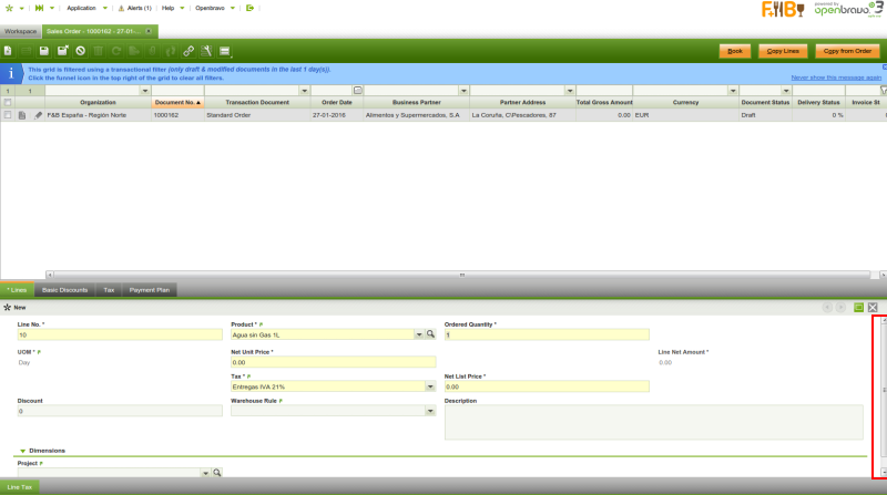 - Select the product 'Agua Sin Gas 1L': the project field is displayed causing the appearance of the scrolling (See attached image, img2.png). Notice that in this case, two requests are done to the FIC in CHANGE mode.