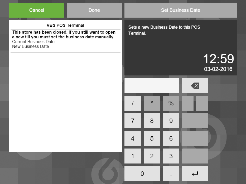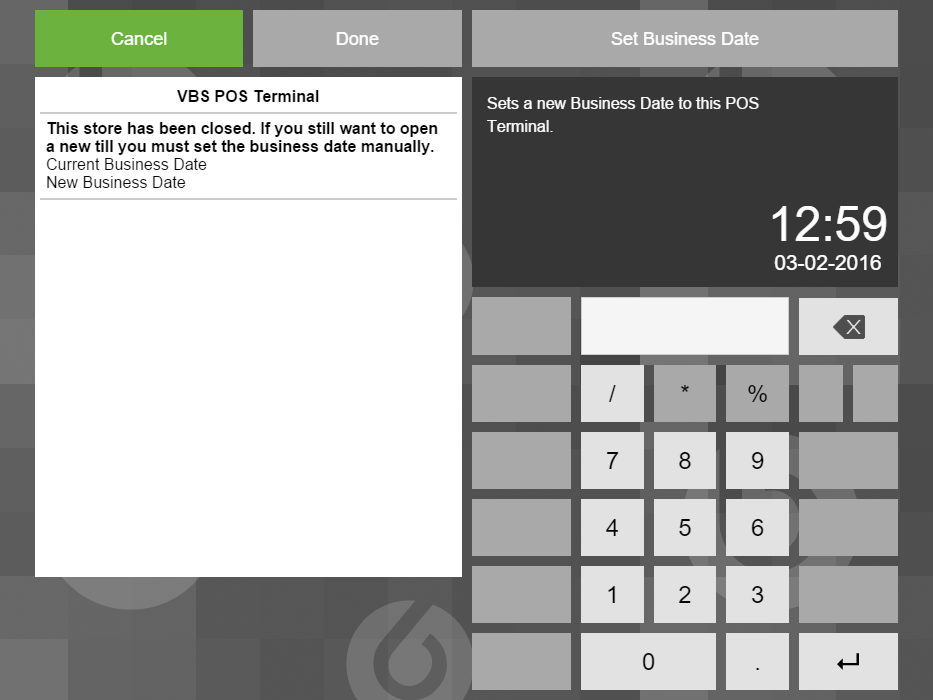 | Description | There are some UI defects in the 'Business Date' window. * The keypad should be the same than in other places, with 'greyed' not needed buttons * The left "This store has been closed..." text should be centered inside the top and bottom lines. * The 'Enter' key should work (the same that click the '┘' enter button). Right now if you introduce a date using the physical keyboard and then press enter (in the physical keyboard) it doesn't happens anything. | |||||||||||