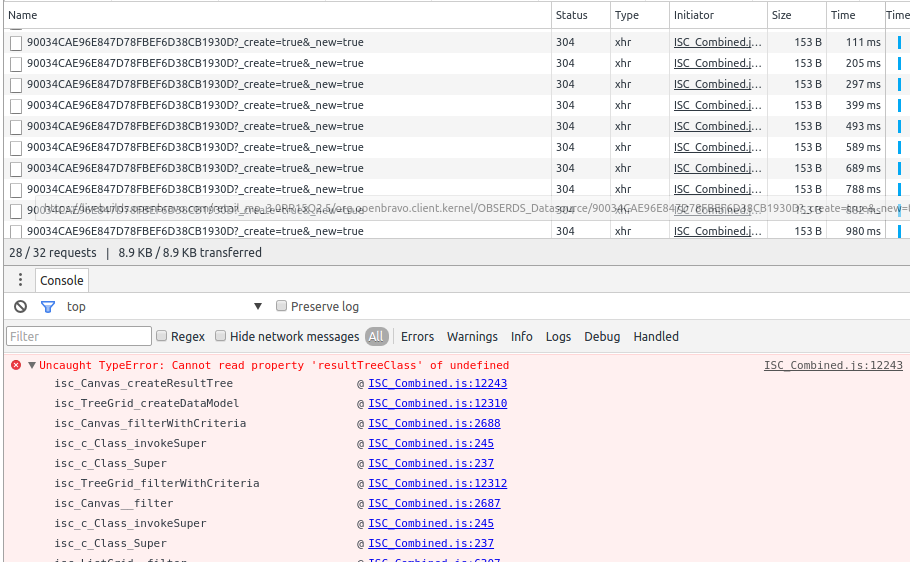 | Steps To Reproduce | 1-Login POS backend as Openbravo and go to "Product" window. 2-Select a product with a few invariants (ie. Alpine skiing backpack 27 L) and go to "Characteristics" tab 3-Click "Update Characteristics" process. 4-Quickly after previous step, click dropdown arrow and check "No items to show" appear. With browser's dev tools tools you can check: * Just after step 3, many identical requests are executed to create new datasources (up to 4 per invariant) * If step 4 is executed before the request to create the datasource for selected combo, the defined problem appears. In this case, the following js error can be seen in console: ISC_Combined.js:12243 Uncaught TypeError: Cannot read property 'resultTreeClass' of undefinedisc_Canvas_createResultTree @ ISC_Combined.js:12243isc_TreeGrid_createDataModel @ ISC_Combined.js:12310isc_Canvas_filterWithCriteria @ ISC_Combined.js:2688isc_c_Class_invokeSuper @ ISC_Combined.js:245isc_c_Class_Super @ ISC_Combined.js:237isc_TreeGrid_filterWithCriteria @ ISC_Combined.js:12312isc_Canvas__filter @ ISC_Combined.js:2687isc_c_Class_invokeSuper @ ISC_Combined.js:245isc_c_Class_Super @ ISC_Combined.js:237isc_ListGrid__filter @ ISC_Combined.js:6307isc_Canvas_fetchData @ ISC_Combined.js:2659isc_c_Class_invokeSuper @ ISC_Combined.js:245isc_c_Class_Super @ ISC_Combined.js:237isc_ListGrid_fetchData @ ISC_Combined.js:6044isc_c_Class_invokeSuper @ ISC_Combined.js:245isc_c_Class_Super @ ISC_Combined.js:237isc.OBTreeItemTree.addProperties.fetchData @ 1f025b6….js:1281isc.OBTreeItemTree.addProperties.show @ 1f025b6….js:1272tree.show @ 1f025b6….js:2929isc.OBTreeItem.addProperties.toggleTreePicker @ 1f025b6….js:1265isc.OBTreeItem.addProperties.showPicker @ 1f025b6….js:1265isc.A.pickerIconDefaults.click @ ISC_Combined.js:8298isc_FormItem__iconClick @ ISC_Combined.js:8699isc_DynamicForm_handleClick @ ISC_Combined.js:8198isc_c_EventHandler_bubbleEvent @ ISC_Combined.js:1336isc_c_EventHandler_handleClick @ ISC_Combined.js:1202isc_c_EventHandler__handleMouseUp @ ISC_Combined.js:1191isc_c_EventHandler_handleMouseUp @ ISC_Combined.js:1185isc_c_EventHandler_dispatch @ ISC_Combined.js:1410(anonymous function) | |||||||