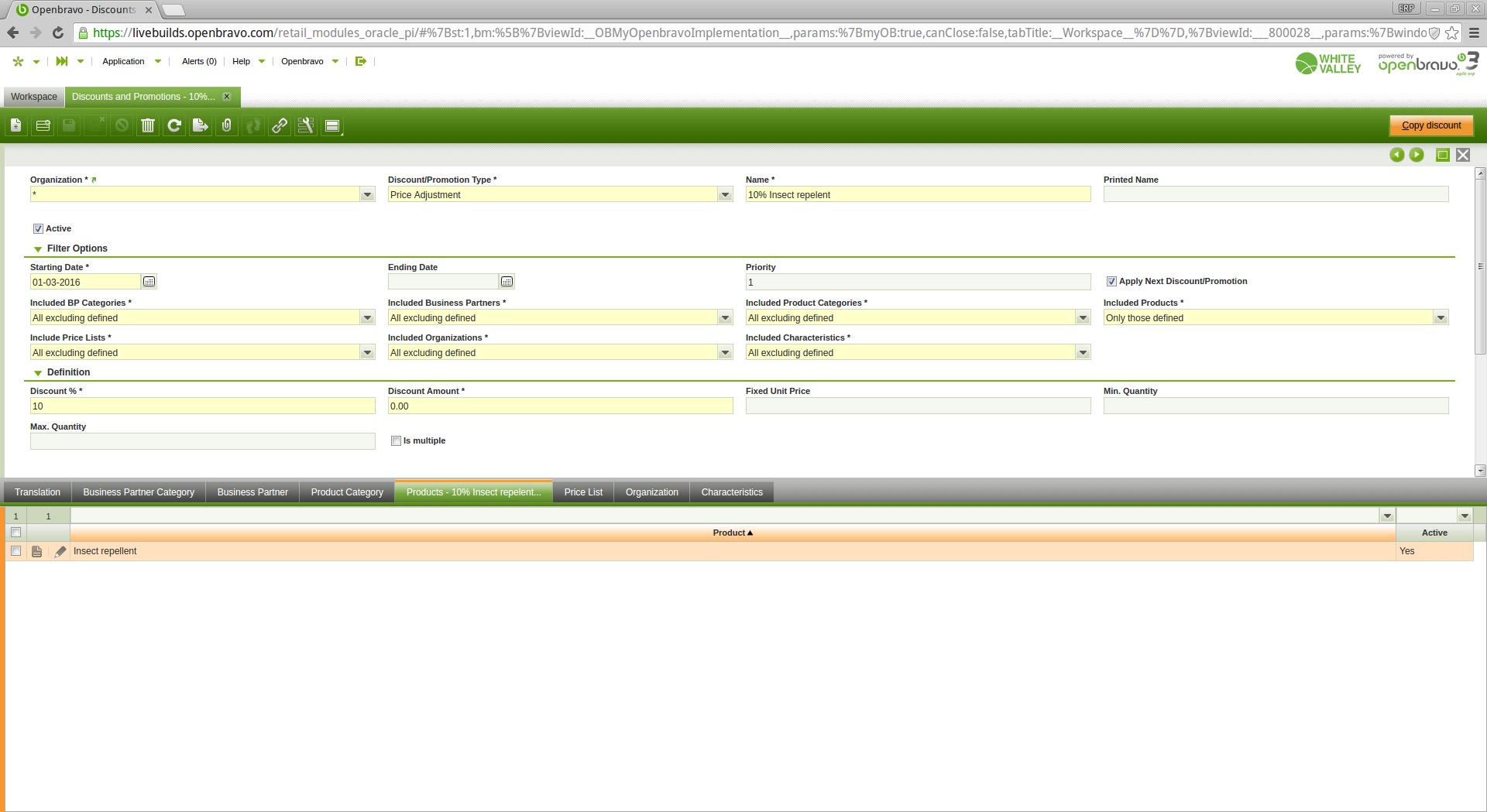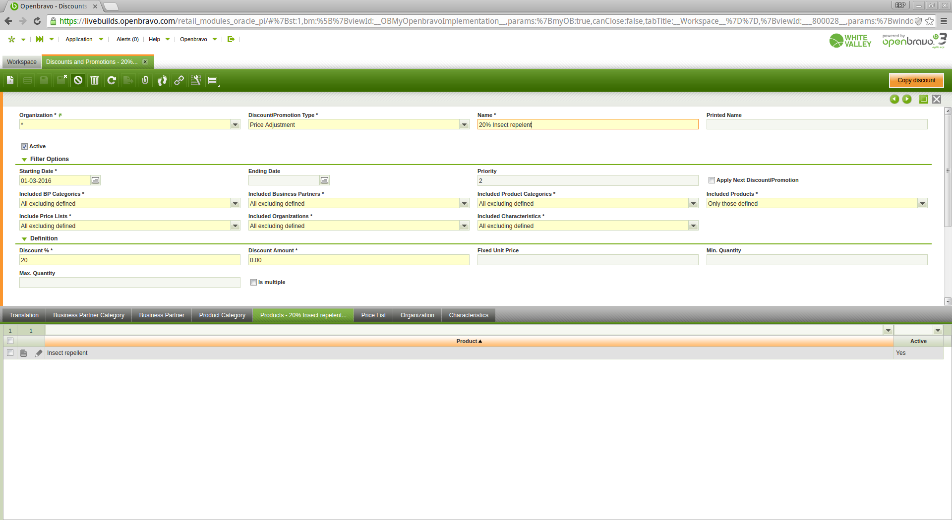 | Steps To Reproduce | In backend define the following discounts and promotions on this window: 1- Create a new promotion and discount for Insect Repelent product and 10% * Org: * * Dsicount/Promotion type: Price adjustment * Name: 10% Insect repelent * Starting date: 1/03/2016 * Included product: Only those defined * Discount %: 10 * Product tab: add the product Insect Repelent Leave the other fields as they are by default 2. Create a new promotion and discount for Insect Repelent product and 20% * Org: * * Dsicount/Promotion type: Price adjustment * Name: 20% Insct repelent * Starting date: 1/03/2016 * Included product: Only those defined * Discount %: 20 * Product tab: add the product Insect Repelent Leave the other fields as they are by default 3. Check a promotion Combo called Torch and Backpack Combo is deffined and it has the product Backpack CB1 25l in the backpackS family In POS 1. Login into WebPOS 2. Click on Laysaway this Receipt 3. Select "Insect repelent", qty=1 4. Add "Backpack CB1 25l", qty=1 5. Click add to receipt 6. Click on the amount button to validate the layaway ERROR --> when clicking on the amount button to pay, the line of "Backpack CB1 25l" has desapeared This org is set up to apply best deal case | |||||||