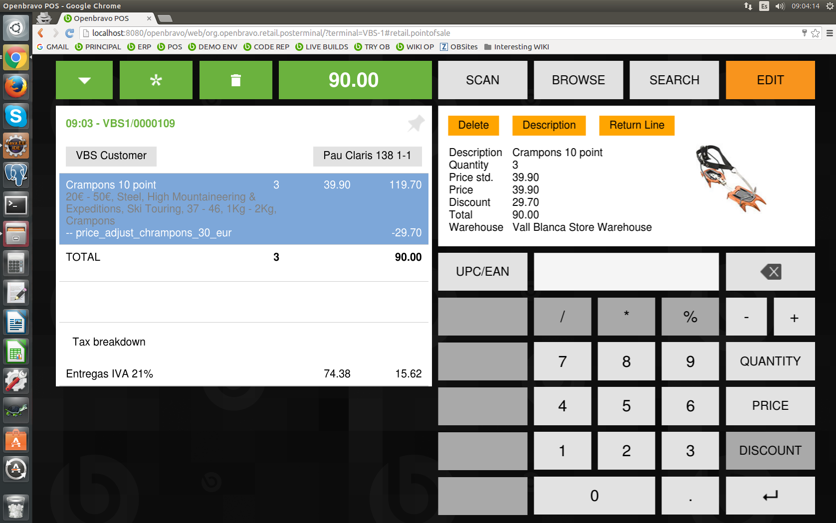1.4 - Go to the menu and click on Receipt discounts. Apply a disc_fixed_5_euro discount to the line.
