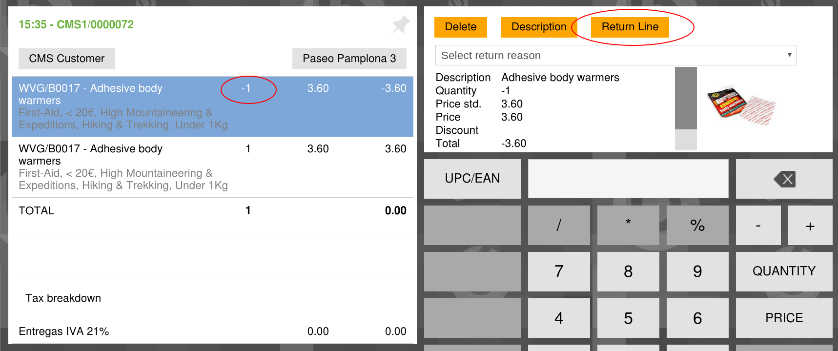 2-Click in the "Adhesive body warmers" line and click "Return Line" button.