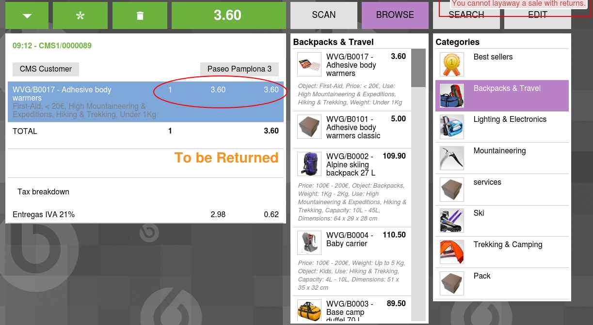 | Steps To Reproduce | 0-Login POS as vallblanca. 1-In dropdown menu, click "Layaway this Receipt". 2-Add 1x "Adhesive body warmers". 3-In dropdown menu, click "Return this Receipt". The following error message will be shown: "You cannot layaway a sales with returns". Besides, The receipt type will be changed from "To be laid away" to "To be Returned", but the product of the receipt will not be set as to be returned. If the receipt is completed now, it will be paid as a usual receipt, not a receipt to be returned. | |||||||||||