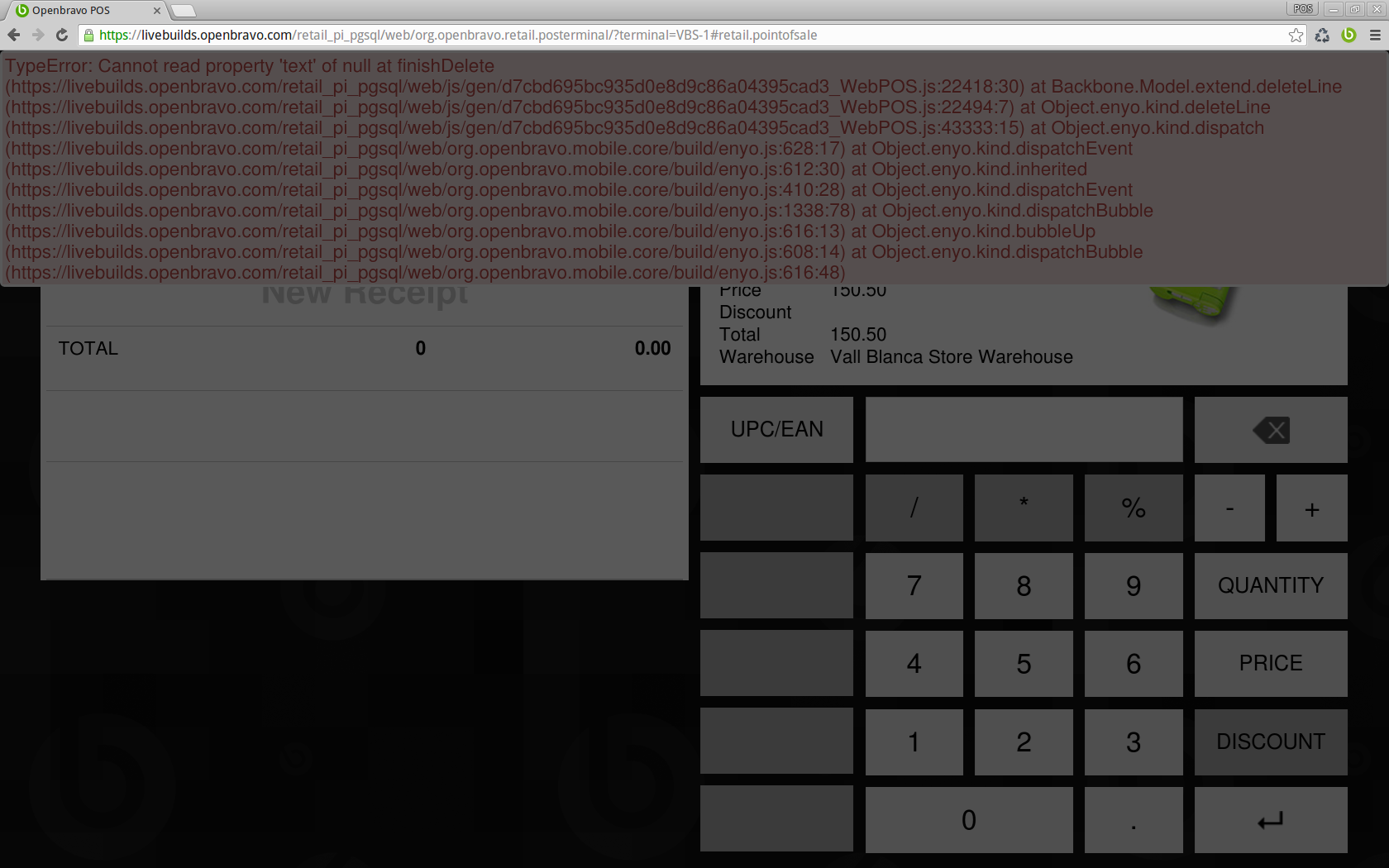 | Steps To Reproduce | 1) Login into Pos Window . 2) Click on Edit (Verify that No Buttons Are visible i.e delete,description,returnLine,Check Stock) 3) Add Product "Avalanche transceiver " 4) Click on Just Added Product . 5) Verify That All Buttons in the Edit Tool bar are Visible . 6) Delete the Receipt . 7) Click on Edit Button bar . 8) Observe the Visible Buttons in the Right side (Edit Tool Bar Buttons) . 9)Click on delete Button (Edit Tool bar) 10) Several javascript errors are shown (see attached screenshot) | |||||||