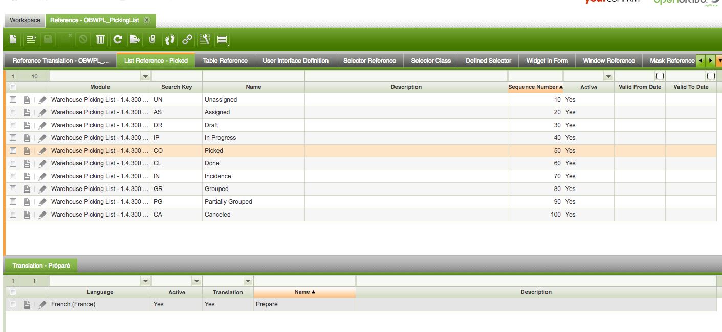 | Steps To Reproduce | Install modules Mobile warehouse picking [1] and French translation [2] [1] http://centralrepository.openbravo.com/openbravo/org.openbravo.forge.ui/ForgeModuleDetail/Mobile-Warehouse-For-Picking [^] [2] http://centralrepository.openbravo.com/openbravo/org.openbravo.forge.ui/ForgeModuleDetail/Translation-FrenchFrance-Fr_FR [^] 1. In https://livebuilds.openbravo.com/retail_modules_pgsql_pi [^] create a Sales order for the organization Yosemite Store with a product 'Baby Carrier' and book the order. 2. Execute 'Generate Picking list' for the 'Picking List type'= Outbound Picking List. 3. Assign the warehouse picking list to the Demouser. 4. Login in https://livebuilds.openbravo.com/retail_modules_pgsql_pi/web/org.openbravo.mobile.warehouse/#login [^] with demouser with language French. ERROR: Check that status is not translated. | |||||||