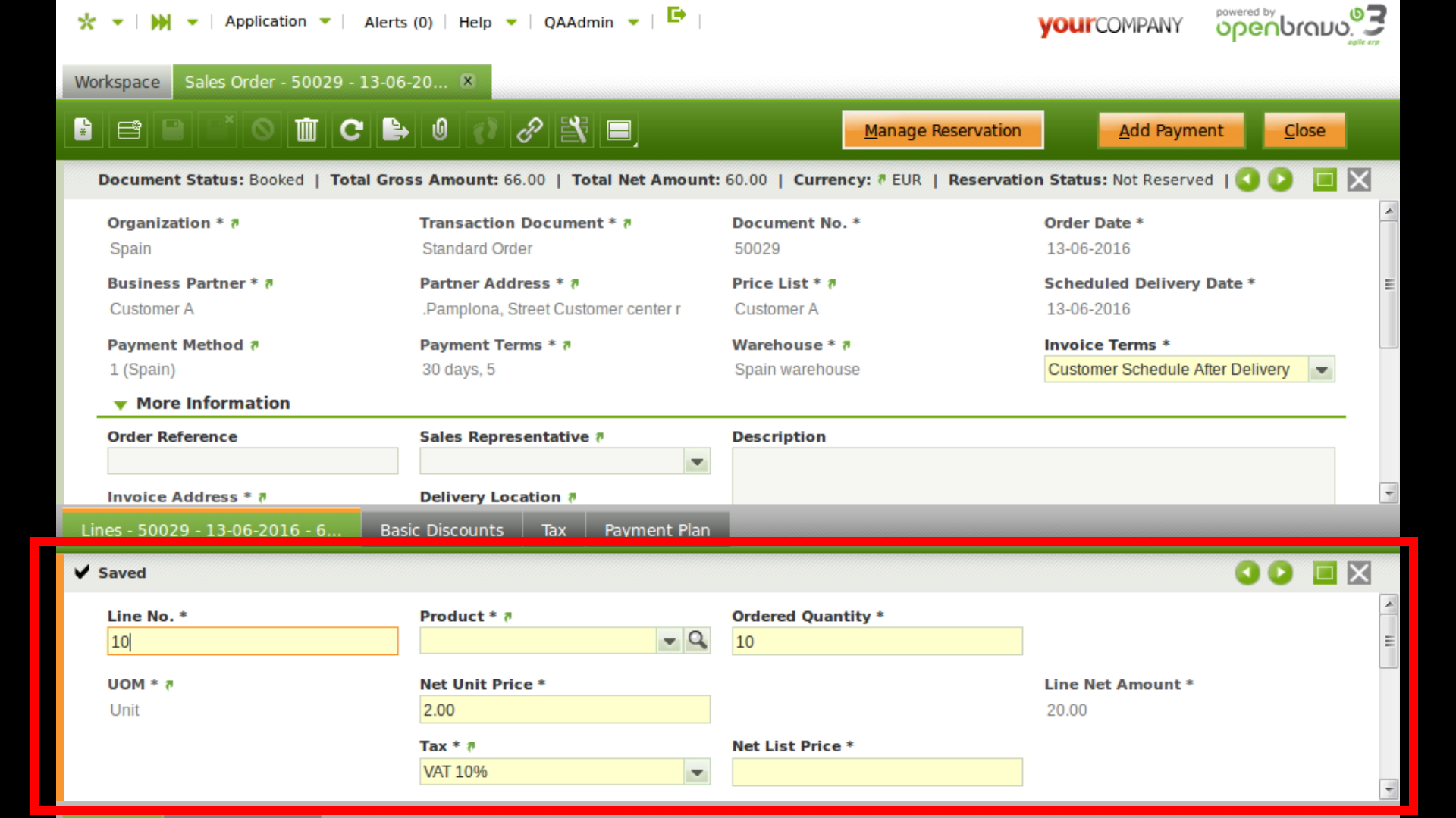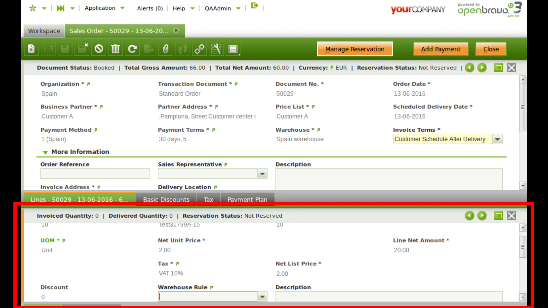 2-Using "QA Testing Admin" as role, go to "Sales Order" window and create a new record with any values, save it and go to Lines tab.