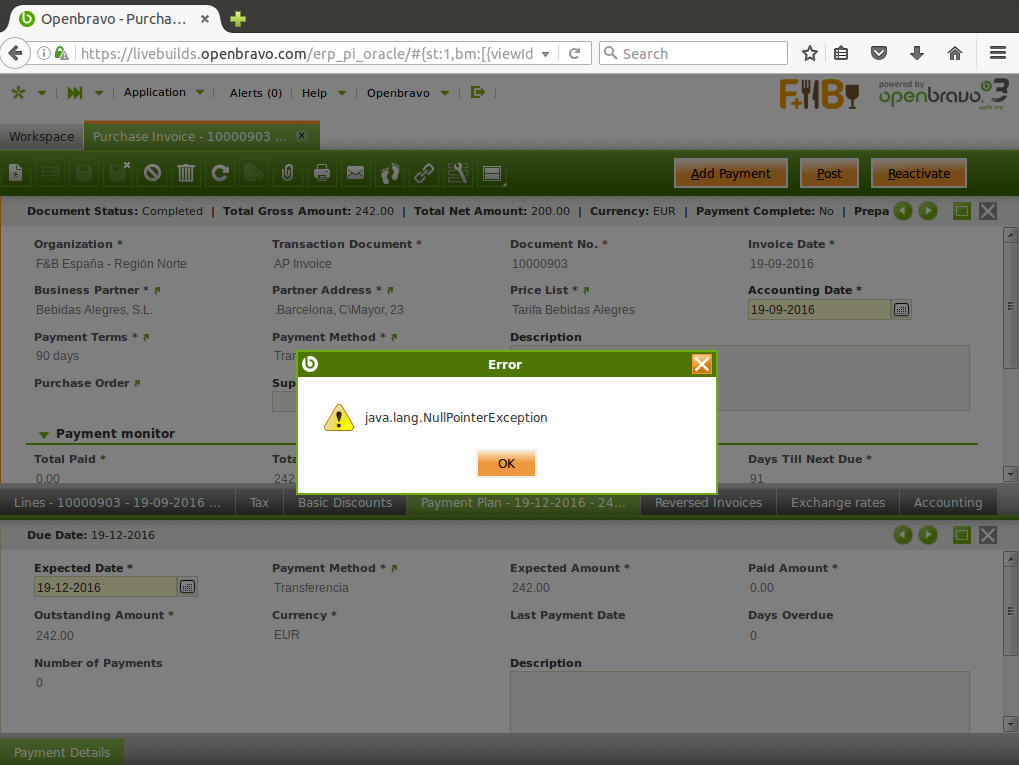 | Steps To Reproduce | 0-Login POS as Openbravo and using F&B España, S.A. - Finanace - F&B International Group role, go to "Purchase Invoice" window. 1-Click "Create a new record in form" button and choose "Bebidas Alegres, S.L." as "Business Partner". 2-Go to "Lines" tab and create a new record. Select "Cerveza Ale 0,5L" in "Product" field. 3-Save and Complete that record. 4-Now, try to Post that record. DEFECT: An error message with the following message will appear: "java.lang.NullPointerException".(check attached image). | |||||||