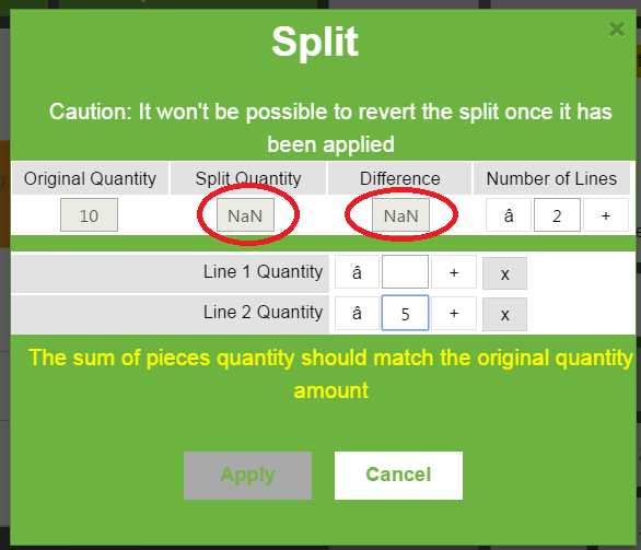 DescriptionWhen splitting lines, if a quantity for a line is left blank, a NaN message is shown in both header fields "Split Quantity" and "Difference". See steps.
