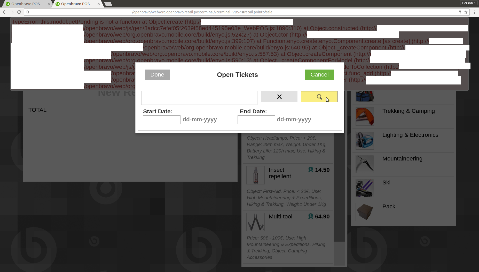 | Steps To Reproduce | 0-Login POS as vallblanca. 1-Disconnect from online mode and, just after that, click in "Pay Open Tickets" in dropdown menu. 2-When the popup appears, click quickly in the search button. DEFECT: An exception will be shown. | |||||||||||