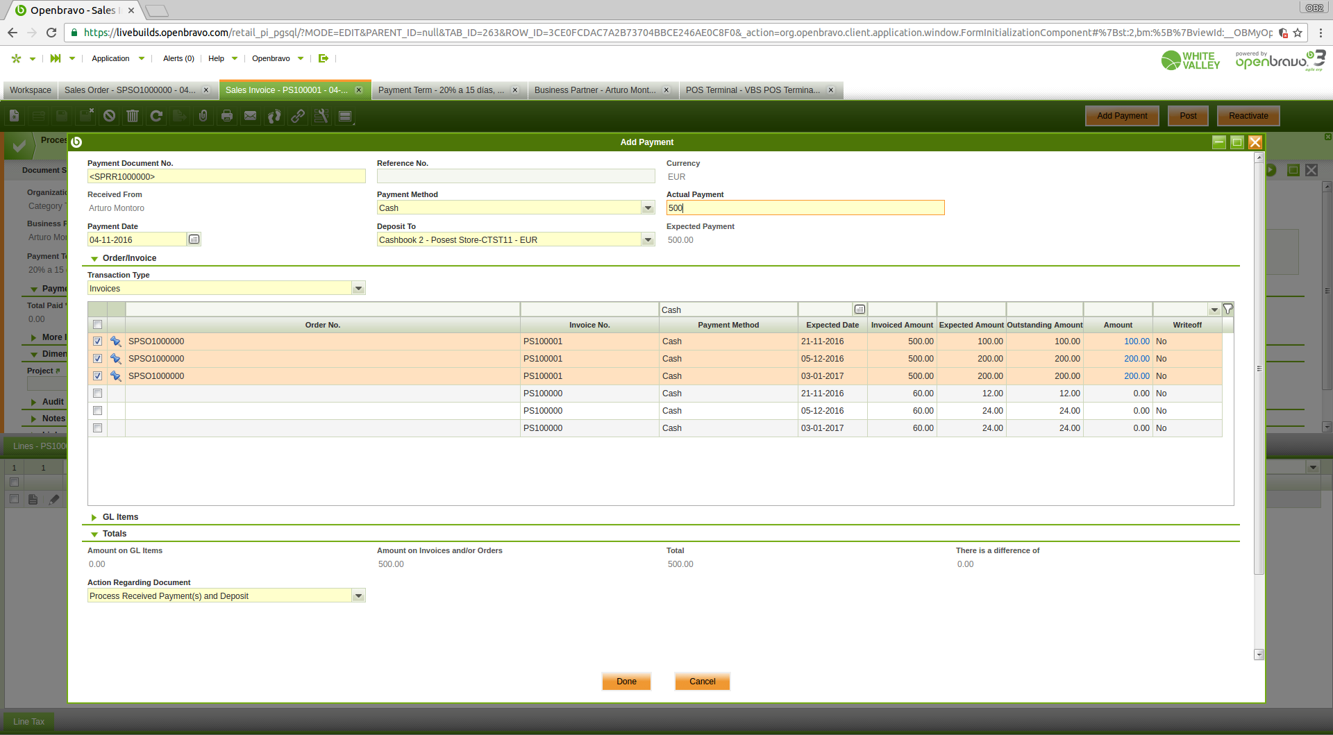 | Steps To Reproduce | in backoffice: . in BP window: change arturo montoro payment terms to: 20% a 15 días, 40% a 30 días y resto a 60 días change credit line limit to 1000 . in POS Terminal type "VBS POS Terminal Type" set: allow paid on credit = true in terminal VBS-1 . do a receipt of Arturo Montoro using credit in backoffice . go to the invoice generated in previous step, and click in "add payment": only one detail is displayed but three should be displayed (see attachment) | |||||||||||