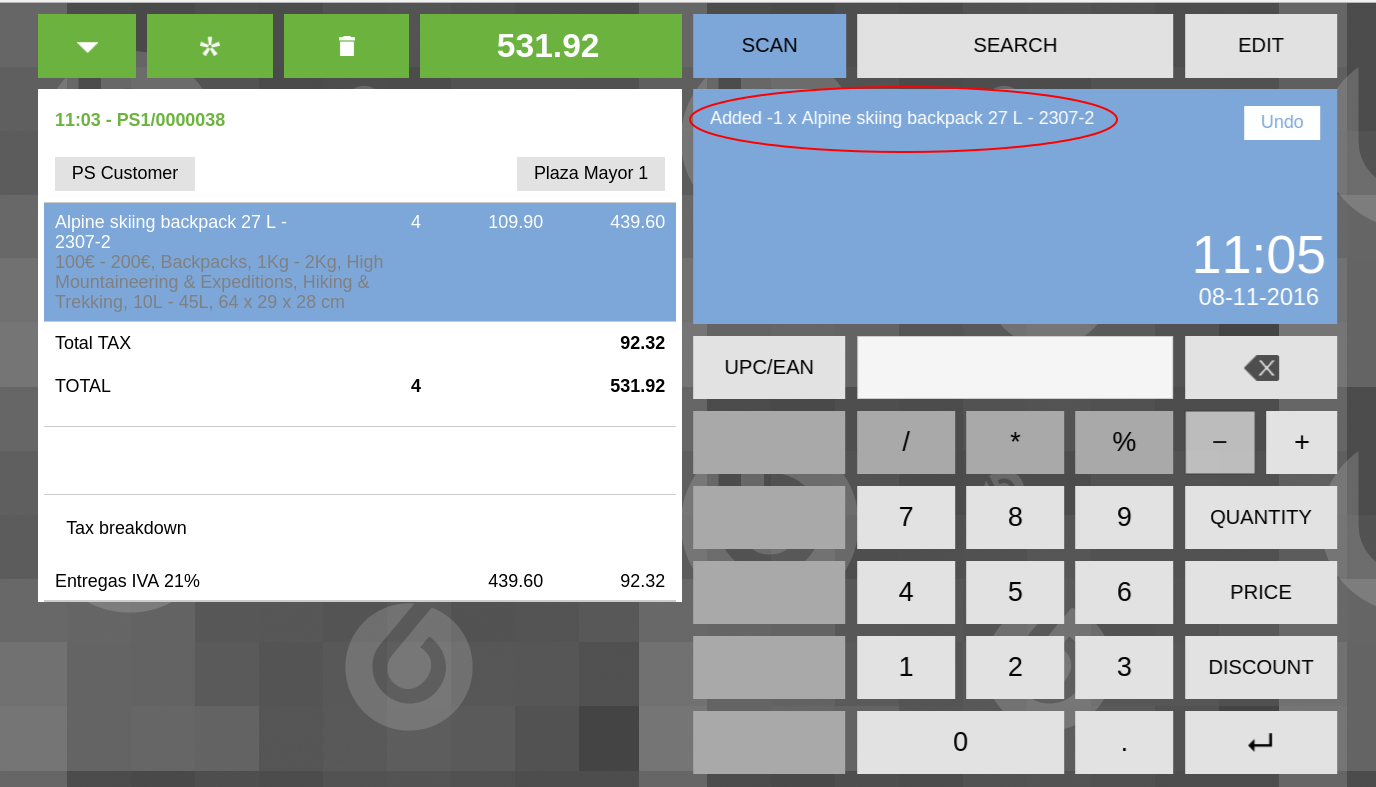 | Description | When filling a receipt, the messages shown when removing an item/changing item quantity for a certain product ("Added -n x <product>") could be replaced by "Removed n x <product>". Could improve user experience. | |||||||||||