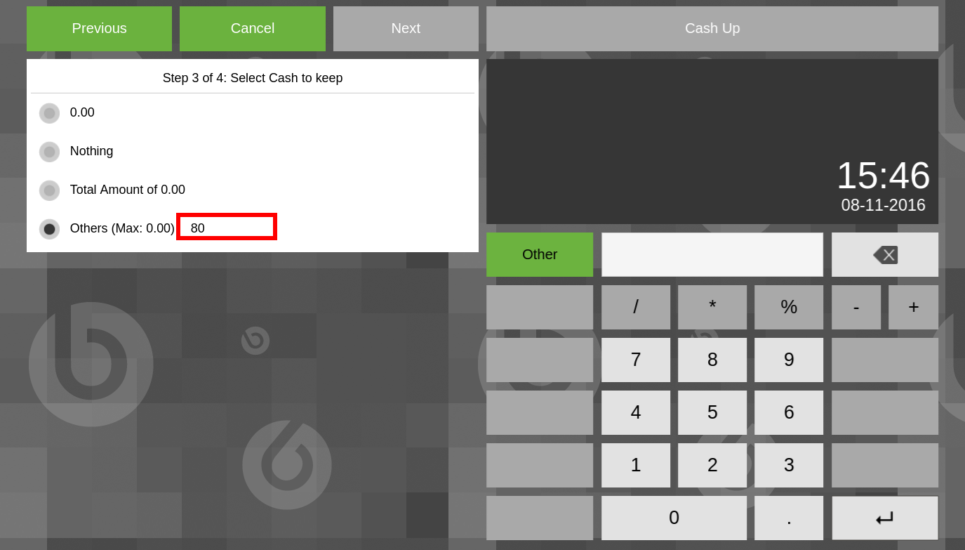 | Steps To Reproduce | Log in to the Web POS, open the Cash Up process, and head to the step 3 "Select Cash to Keep". Check attachment. | |||||||||||