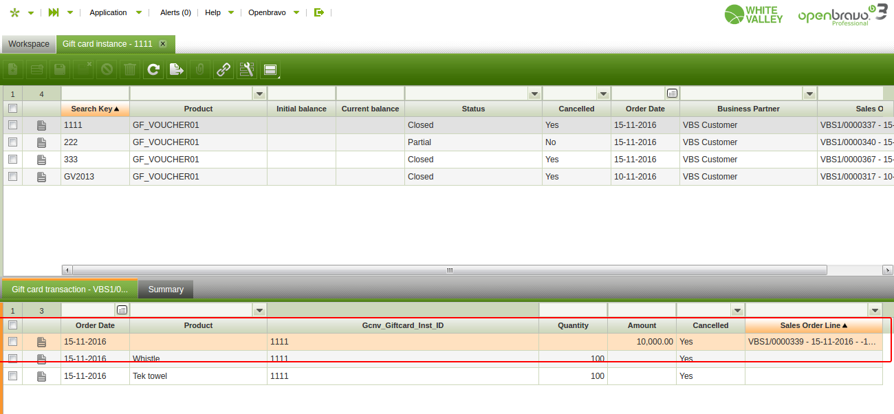 3-Go to "Gift card instance" window || "Gift card transaction" tab. Realise there is a lone with Product field empty and with Amount field filled with the quantity of the Gift card cost. It is not clear enough for a user to know that it is the gift card return.