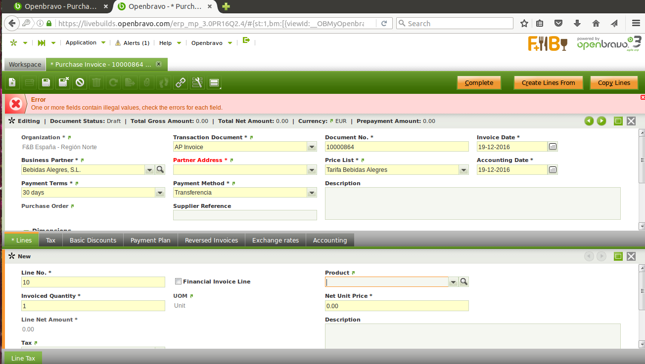| Steps To Reproduce | 0-Login ERP as Openbravo. 1-Go to Purchase Invoice window. 2-Click "Create a new record in form" button. 3-Click arrow from Business Partner field and select "Bebidas Alegres, S.L." 4-Click Lines tab. 5-Click "Create a new record in form" button. 6-Click arrow from Product field and select "Cerveza Ale 0,5L". 7-Click Complete button. And click OK button in that popup. 8-Click "Create a new record in form" button. 9-Click arrow from Business Partner field and select "Bebidas Alegres, S.L." 10-Click Lines tab. DEFECT: Realise Partner Address is empty 11-Click "Create a new record in form" button. 12-Click arrow from Product field and select "Cerveza Ale 0,5L". Save that record. It is saved even with an error. | ||||||||||