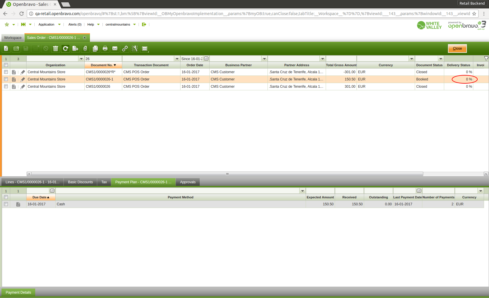 | Description | The Sales Order with 'Document No.' followed by "-1" (new Sales Order created by Cancel and Replace feature in the POS) doesn't show 'Delivery Status': "100%" as it should when deleting an article and overpaying with a payment method different to "Cash". | |||||||||||