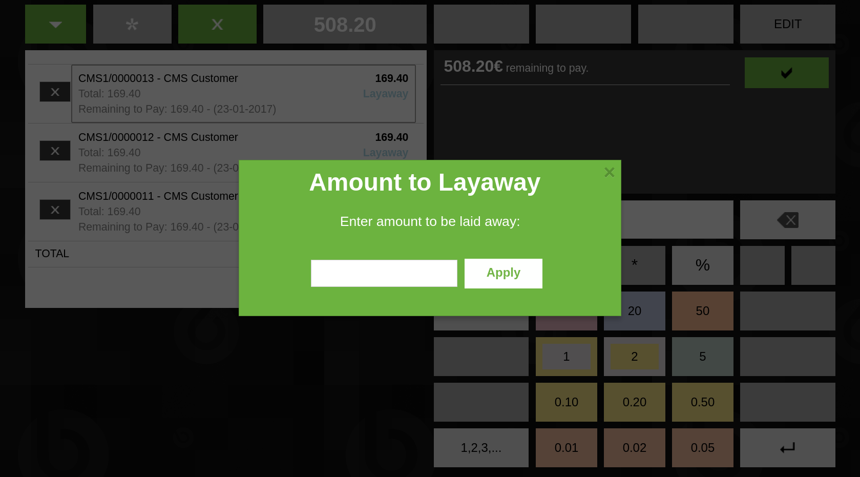 | Steps To Reproduce | 0. Log in the Web POS as user "vallblanca" 1. Create more than one Layaway with the following steps 1.1. Click on the Browse button and select some products (p.e., "Avalanche transceiver" and "Headlamp ultralight") 1.2. Click on the Total button (should be shown as "169.40") 1.3. Open the dropdown menu and select the "Layaway this Receipt" option 1.4. Click on the "Layaway" button to complete the receipt 2. Select "Pay Open Tickets" option from the dropdown menu 2.1. Click on the search magnifying glass and select all the created layaways 2.2. Click on "Done". Testing the validations mentioned in the description on the "Pay Open Tickets" screen 3. Click on a Layaway to open the "Amount to Layaway" popup | Set the values and click on 'Apply' 3.1. Type in '&%50', '%50&', '&50%' , '50%&', '%50%' to check [1.3] 3.2. Type in '&40', '&40.', '&40.1' '&40.15', '&40&', '&40.&', '&40.1&' '&40.15&' to check [2.1] 3.3. Type in '40&', '40.&', '40.1&' '40.15&' to check [2.2] 3.4. Type in '%35', '35%' to check [2.3] | |||||||||||