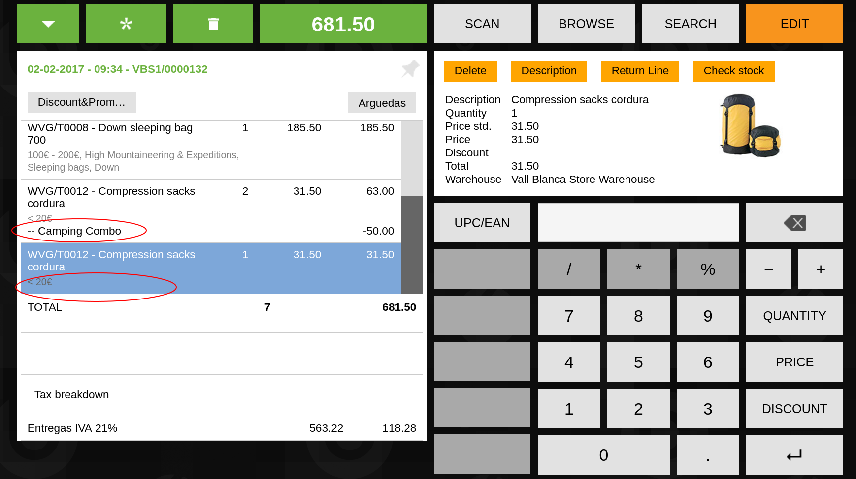 * Compression sacks cordura, Units: 1, Amount: 31.50, Discount (Camping Combo): -50.00