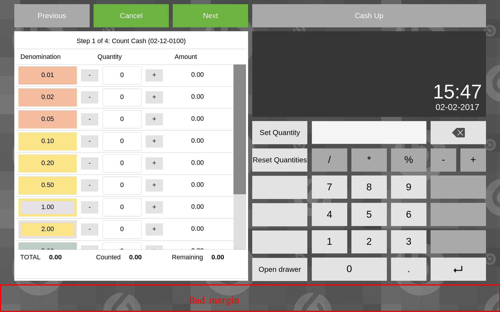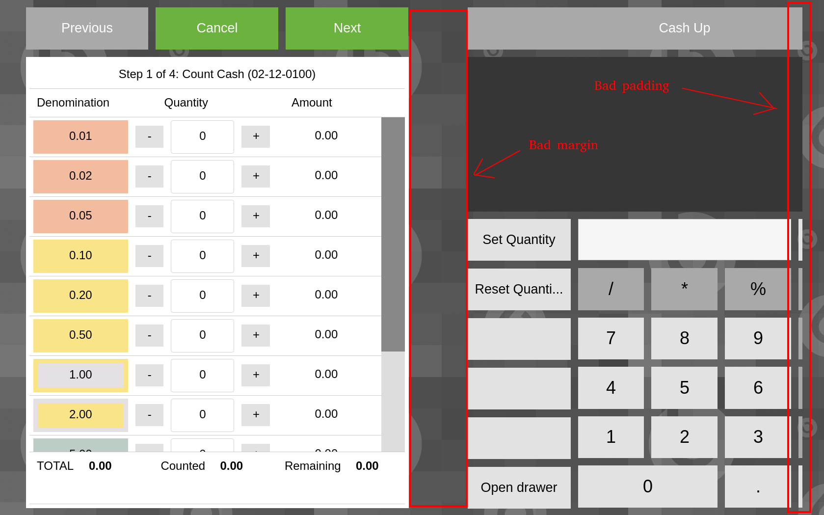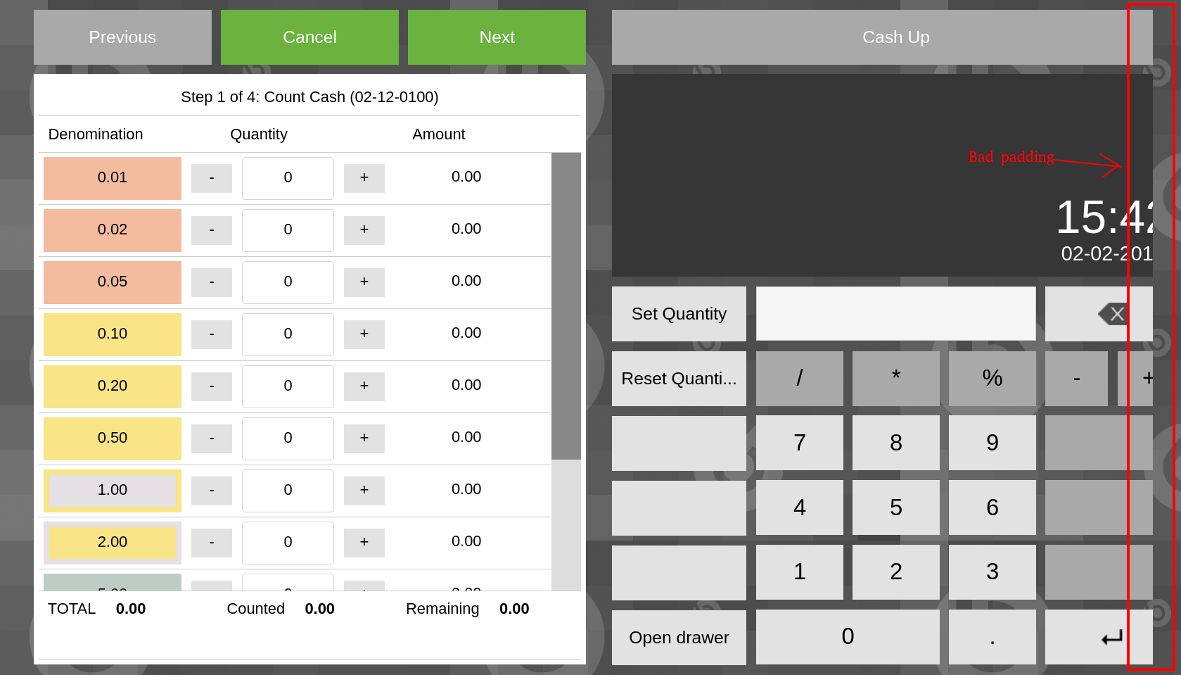 | Description | In cash up screen, resizing the window or setting it to fullscreen doesn't work properly. The following graphical bugs occur (as shown in screenshots): - Buttons and panels mix up. - Panel padding and margins change between resizings of the window | |||||||||||