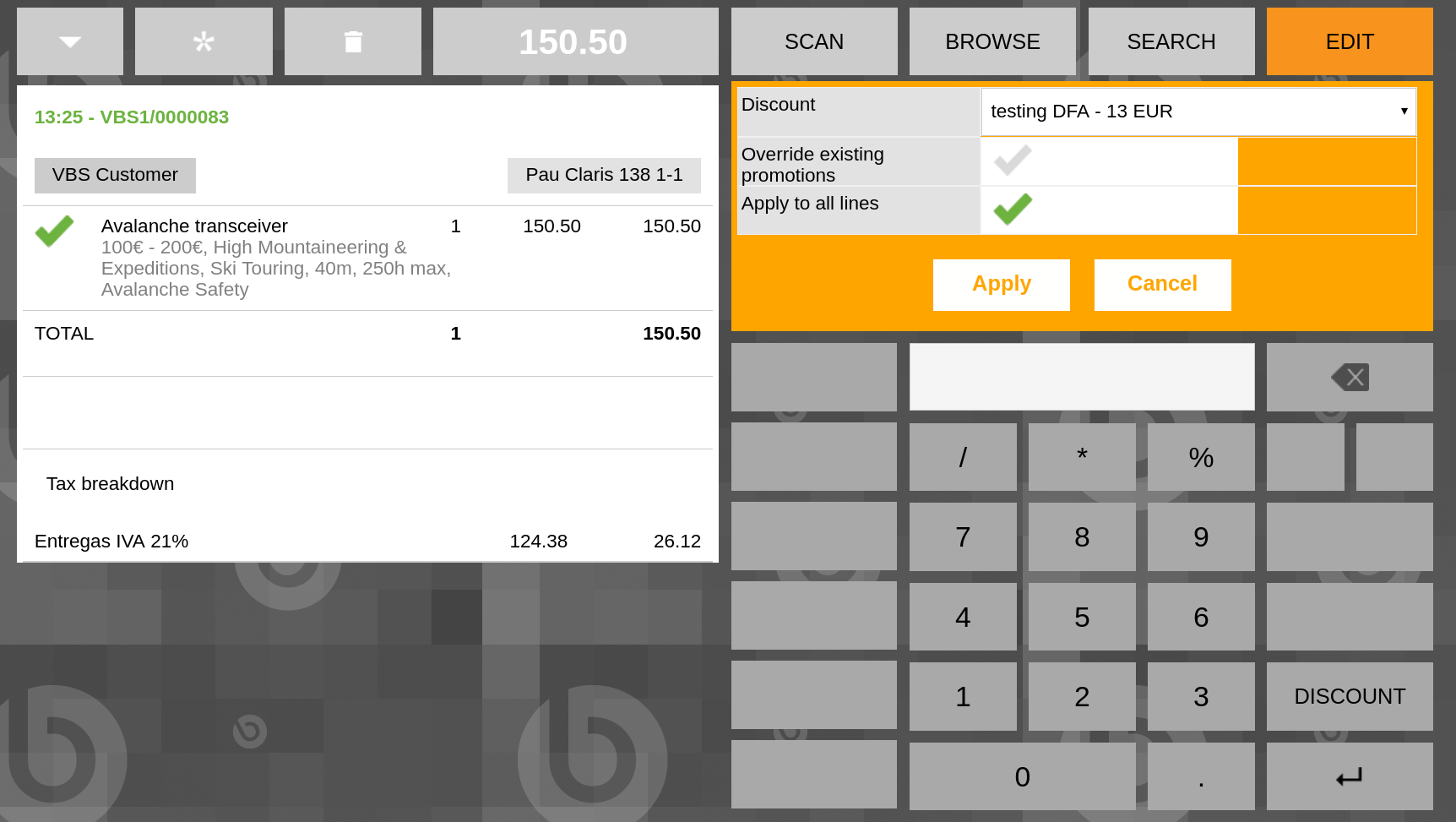 | Steps To Reproduce | 0-Login backend and go to Discount and promotions window. 1-Create a record using the following values: -- Organization: * Discount/Promotion Type: Discretionary Fixed Amount Name: Test Starting Date: 01-01-2017 Included Products: Only those defined Discounted Amount: 12 -- Save. 2-Go to Products tab and add a record, using "Alpine poles" as Product. 3-Go to WEB POS and login as vallblanca. 4-Add 1x "Avalanch transceiver" and, in dropdown menu, click "Receipt discounts" option. 5-At the right of the screen, click in Discount dropdown, realise the just created discount for "Alpine poles" is eligible. DEFECT: It has been configured to be used only for "Alpine poles", but it can be applied for "Avalanche transceiver". | |||||||||||