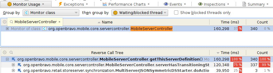 | Description | MobileServerController.getThisServerDefinition method is invoked all the time from many different places. It is synchronized on a singleton class, which in practice, means there is only thread per JVM that can execute it. This method causes some contention at JVM level. The situation can become worse in scenarios with overload, if number of DB connections is limited at pool level. Because in some cases, the connection for the thread is borrowed from pool inside this method, this can cause deadlock situations if: -pool size=1 -thread 1 acquires the connection anywhere -thread 2 inside this method tries to get a new connection, it cannot get it till thread 1 returns the one it previously borrowed -thread 1 invokes MobileServerController.getThisServerDefinition -> DEADLOCK: it won't be able to execute this method till thread 2 completes it, but it is waiting for thread 1 to release its connection | |||||||