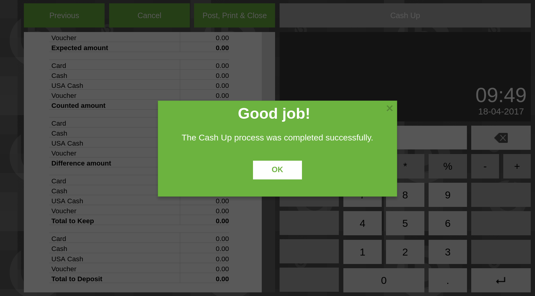 | Description | When a cash up is complete, the following message must be shown: "Good job! The Cash Up process was completed successfully." If the printer set in POS Terminal window but it is not available, that success message is not shown and it is only shown the "Printer and display are not available." message. | |||||||||||