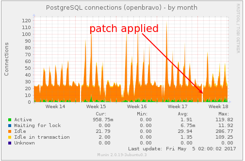 Attached screenshot of munin DB connections graph in a real customer with a daily 250 concurrent backoffice users. |
