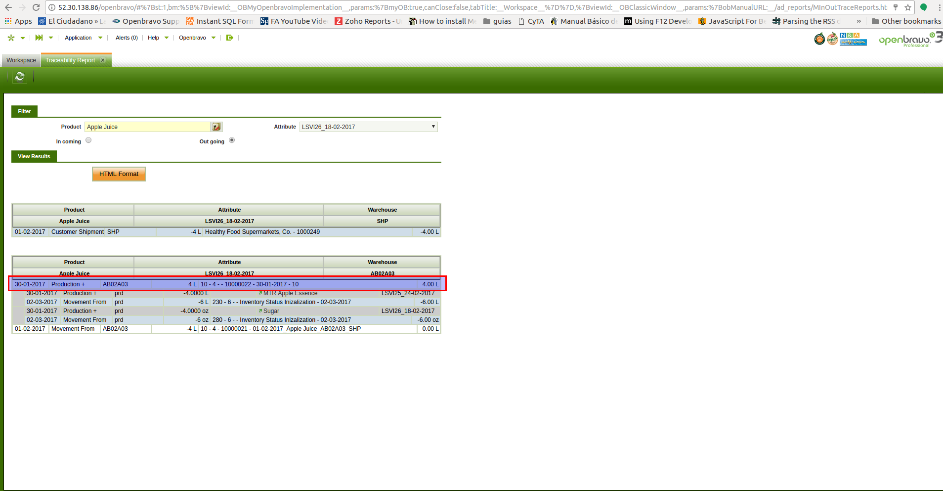 | Steps To Reproduce | 0. Create Show MRP and Production fields preference. 1. Product window: create 2 Products for raw materials and final products. a. Production checkbox selected. b. For Raw materials the Purchase flag should be checked. For final products the purchase checkbox not selected. Both should have attributes defined (Lot) Manufacturing tab: add a new register for organization España Región Norte and select a Bin for the Final Product. 2. Manufacturing Cost Center window: Create new record, select US in the organization field, type search key and name. 3. Activity window, to configure the Production Activities: - Create new record, selecting US in the organization field. - Select the cost center required, - Type search key and name. 4. Process Plan window: create the process Plan by typing Process Plan in the quick launch menu and create new record: Select US in Organization type search key and name Process unit and Conversion rate 4.a. Version tab: create a version for the Process Plan with starting and ending date 4.b. Operations tab: create the operations needed for the Process Plan. Create one record defining the sequence of the Process Plan. type search key and name. Select the activity. Check Create Standards 4.c. I/O Products tab: input-output of the products of the sequence. Create a new record and select Product Production Type (if product is consumed P- or produced P+ in the production process) Quantity needed. 5. Product window: for the Final Products it is necessary to select the Process Plan created for the corresponding product. 6. Work Requirement window: Create new record, select España Región Norte in the organization field Select quantity, creation date, starting date, ending date Select the Process Plan that this work requirement refers to Press Process Work Requirement button and the information from the Process Plan will be inserted Create Work Effort 7.- Work Effort window: select the Work Effort previously created, add the Lot for the Final Product and Validate the Work Effort. Launch the Traceability report (either incoming or outgoing) and select the Final Product and the attribute. The column name of Product, Attribute and Warehouse appear but there is no information regarding the columns below (see the attached image). It is possible to guess what is the meaning of each column but it is not clear at all the information of the last column | |||||||