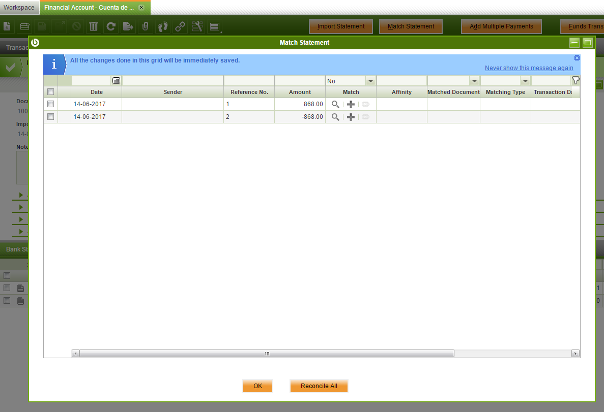 | Description | Nowadays, when there are two bank statements with the same opposite values, those are shown as unmatched and there is not an automatic way of canceling them. In the same way that a bank statement can match several transactions, there should exist a button in the selector to say, check 100 and check -100 and match those. | |||||||||||