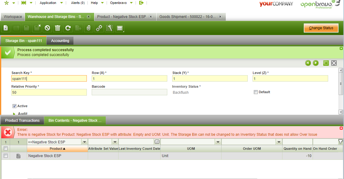 6. Move back to Storage Bin Tab, select spain111 and click on Change Status Button