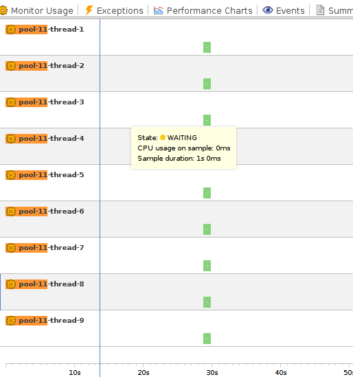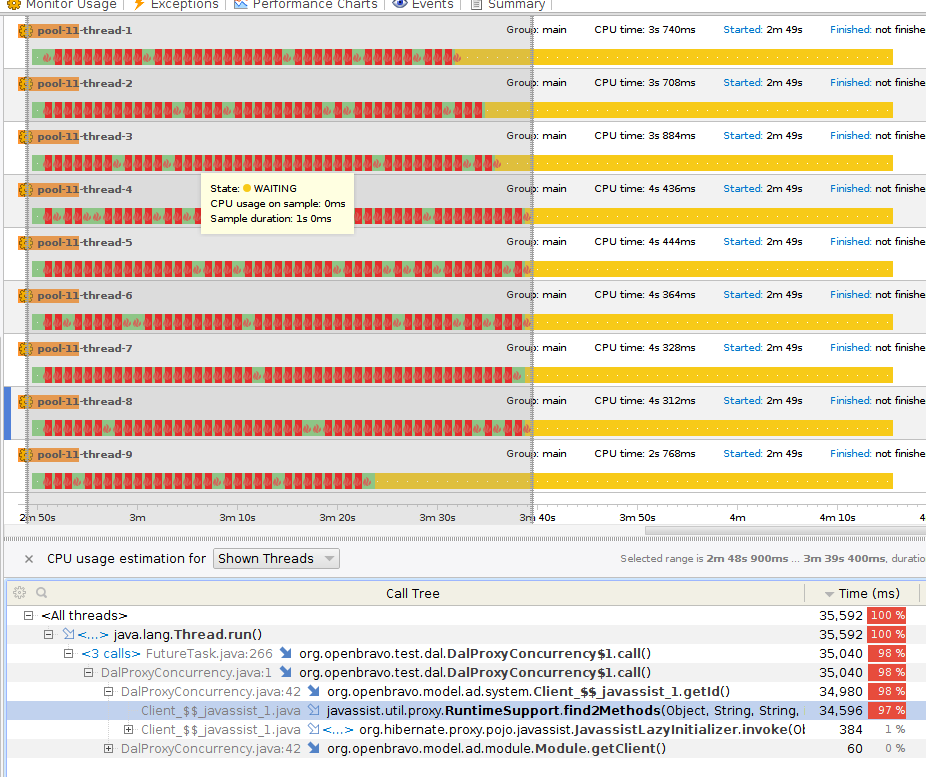| Proposed Solution | This is an issue [1] in the javassist version that currently Openbravo depends on (3.14.0-GA), which is fixed since 3.17.0-GA. Decide to which version update, maybe to 3.20.0-GA, which is not the latest one but the one currently Hibernate depends on [2]. Note 3.17 seems to be buggy an Hibernate moved from it [3][4]. Testing with 3.20.0-GA solves the contention issue (see attached image) which is the same test execution without any thread waiting. --- [1] https://issues.jboss.org/browse/JASSIST-163 [^] [2] https://github.com/hibernate/hibernate-orm/blob/00492a3707b9128b34646166f6eff402a8169011/libraries.gradle#L20 [^] [3] https://hibernate.atlassian.net/browse/HHH-7923 [^] [4] https://issues.jboss.org/browse/JASSIST-189 [^] | |||||||