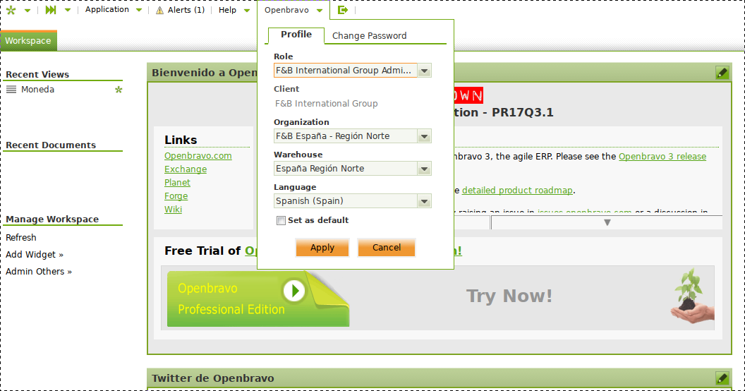 | Steps To Reproduce | 1) Install the Spanish Localization pack 2) Ensure that there are not modules in "in development" status 3) Log-in as F&B International Group (it has English language by default) 4) Switch to the Spanish language 5) Note that some labels do no appear translated: in the toolbar, profile widget or in the workspace (see attached image). | |||||||
