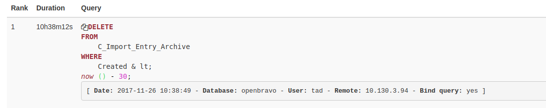 | Description | The following executed query took more than 10 hours in BUT production environment (see attached images of Munin and pg_badger): DELETE FROM C_Import_Entry_Archive WHERE Created & lt; now () - 30; | |||||||