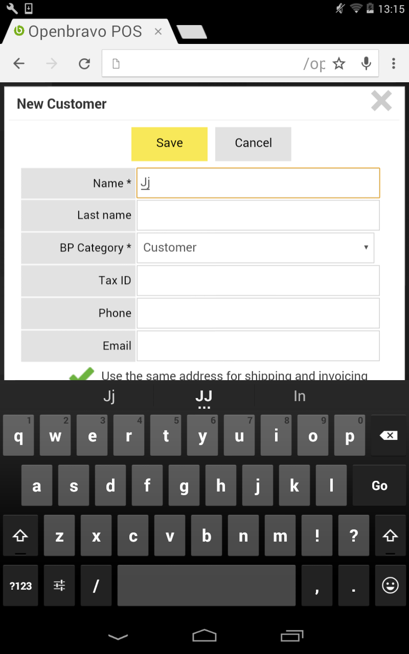 | Description | Creating a new Customer with the Nexus tablet in portrait (vertical) mode, it is not possible to fill the fields below "Use the same address for shipping and invoice" sentence. The keyboard is hiding those fields and it is not possible to drag the window to be able to fill those fields. | |||||||||||