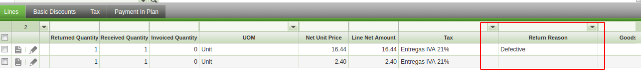 | Steps To Reproduce | 0-In POS Backend, go to Return Reasons and create two return reasons with the following names: Test1 and Test2. Save them. 1-Login POS as vallblanca. Create a new receipt. Add to the receipt 1x Whistle and 1x Tek Towel. 2-Click in the Whistle line and click in Return Line button. Then select the return reason "Test1". 3-Click in the Tek Towel line and click Return Line button. 4-Now, select return reason "Test2". After that, click again in the selector and click "Select return reason". Click again in the selector and choose "Test2" once again. 5-Complete the receipt. DEFECT: In the backend, go to Return from Customer window and realise the second line will not have saved the return reason. | |||||||||||