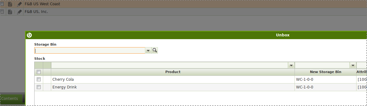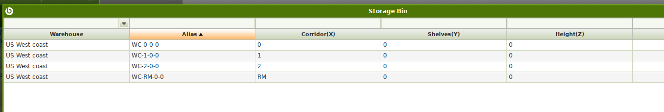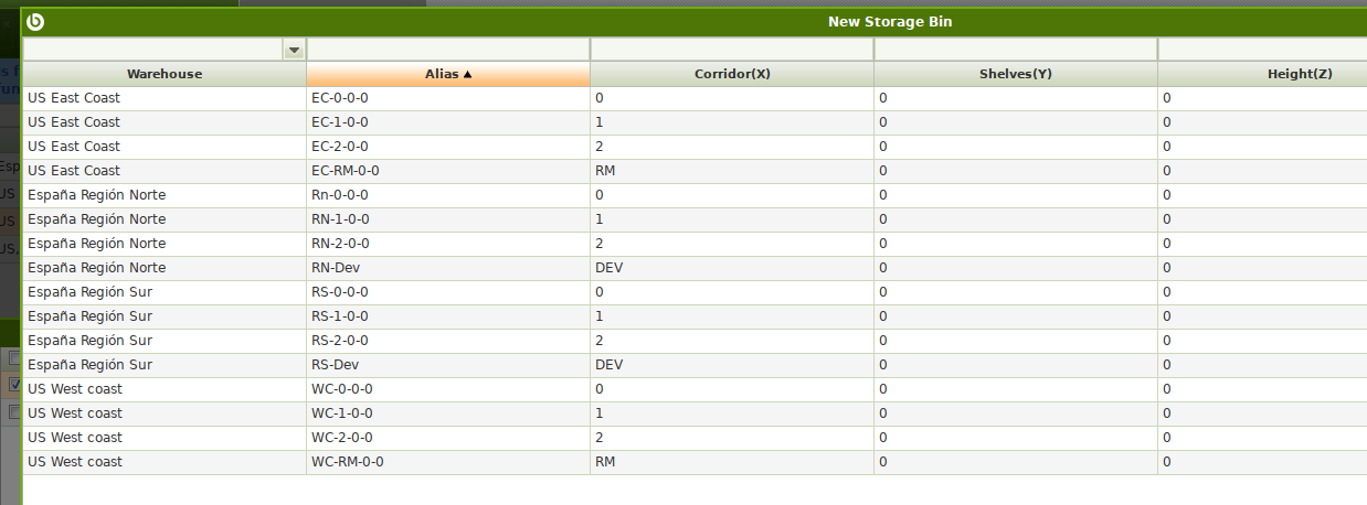 Open selector at header level and clean any filter. Verify it only shows bin for West warehouse (OK)