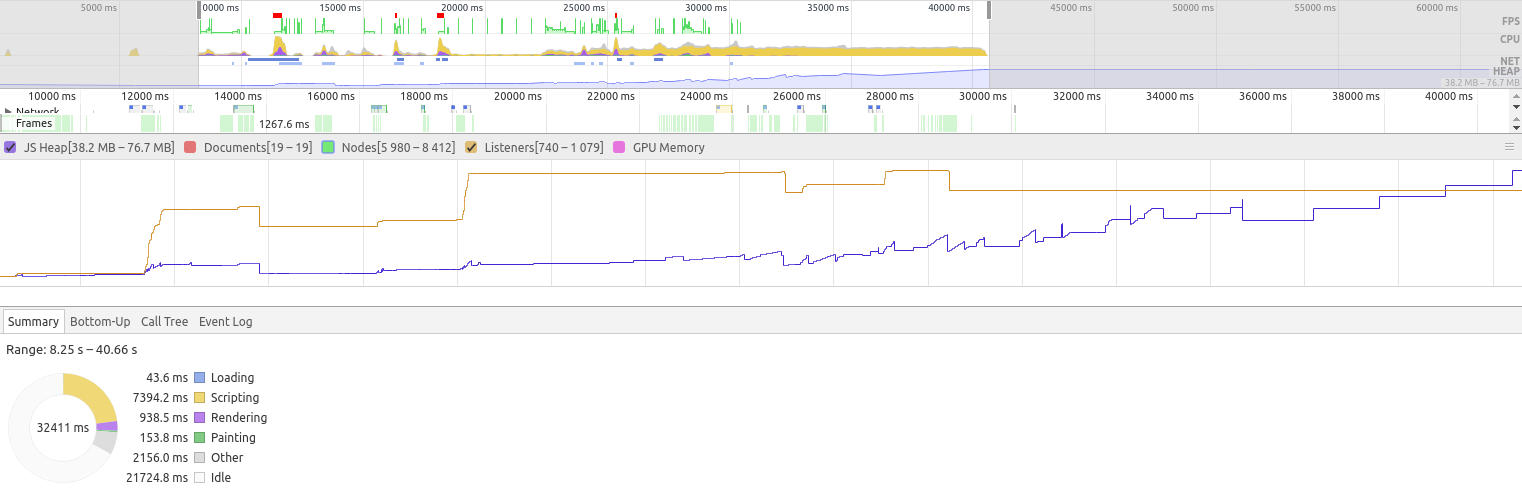 Attached dev tool's performance monitor shows js heap memory during ~1 minute of Unbox button usage. In the following link, there are js head dumps before, during, and after the memory leak: https://drive.google.com/open?id=1mYBmtD9GmCv1ESO2pWLf6BMQTkAWR6_5 [^] |