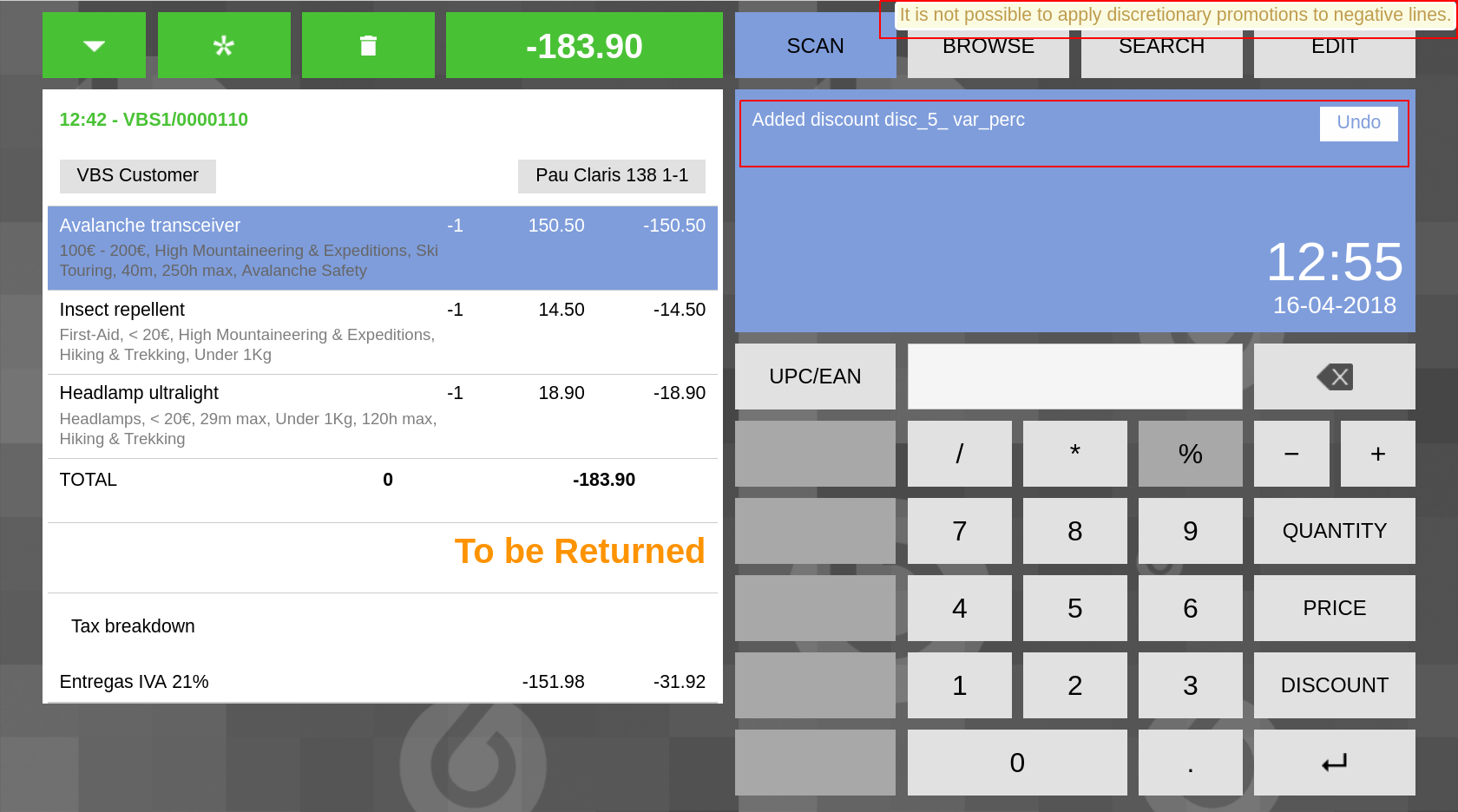 made for the return line), but the "Added discount *" message appears incorrectly.