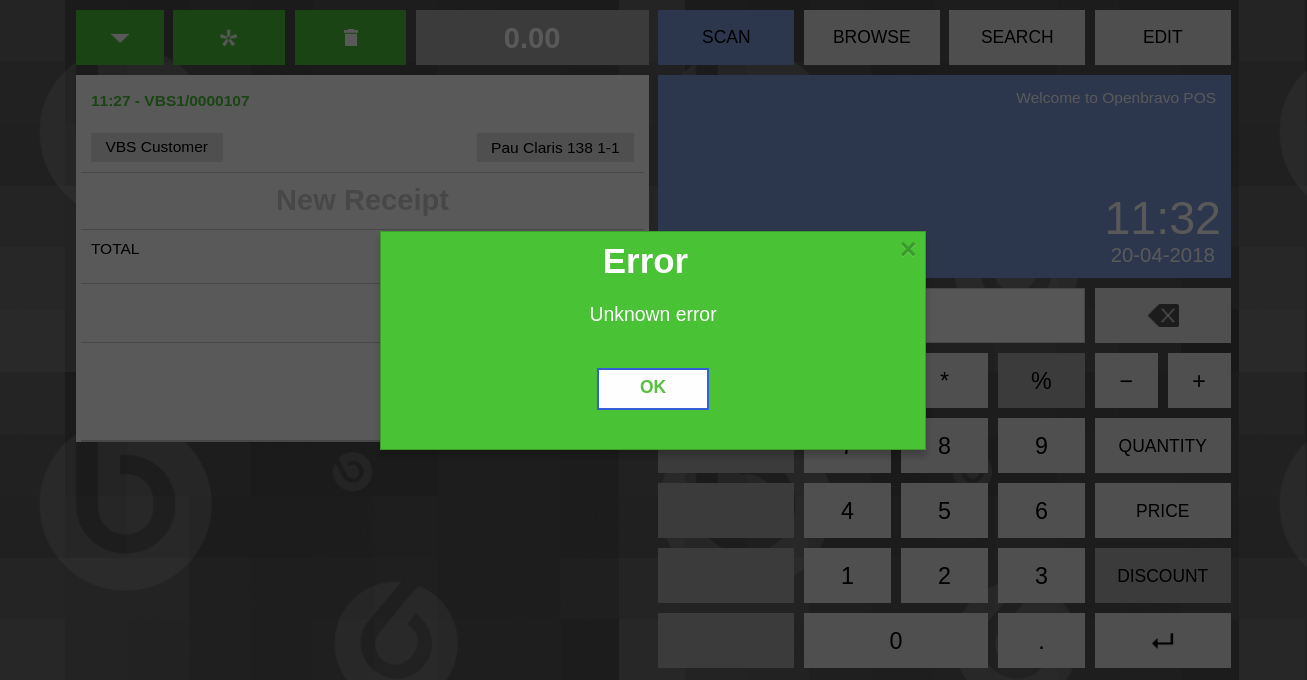DescriptionWhen using the simple filtering functionality in the Open Receipt popup, if "Amount To" or "Amount From" filter is applied with an empty value, an "Unknown Error" popup is displayed as depicted in the attached picture. No inconsistencies seem to be created after dismissing the error.