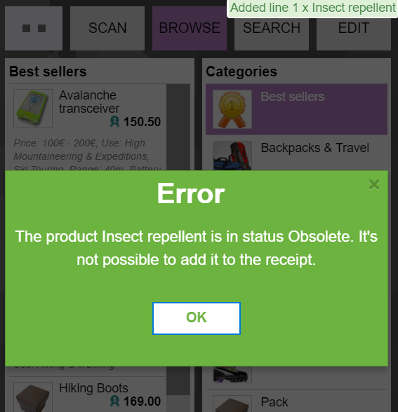 | Steps To Reproduce | 1. Having a product marked as Obsolete in the backend, log in in the webPOS 2. Browse/search the product list. Note that there is no information about the Life Cycle Status of the products. 3. Choose a product that has not been changed (ie. it is still available) 4. As expected, the product can be added to the ticket 5. Choose the product marked as obsolete in step one 6. An error message is shown as in the attached screenshot. | |||||||||||