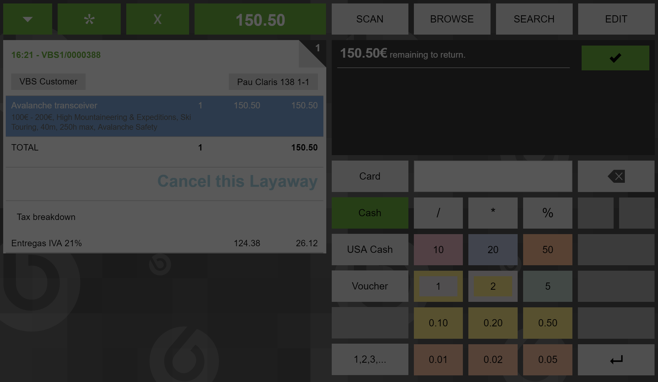 1-Add 1x "Avalanche Transceiver" to the receipt. In the dropdown menu, click "Layaway this receipt".