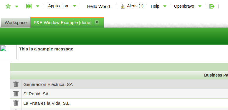 | Steps To Reproduce | - Install org.openbravo.client.application.example module. - Apply the retryExecutionMsg.patch file over this module. - Recompile using ant smartbuild -Dlocal=no to apply database changes. - Start tomcat - Go to Application|Application Examples|P&E Window Example - Tap into Done button - A "This is a sample message" message should appear at the top with no background as the screenshot provided. | |||||||