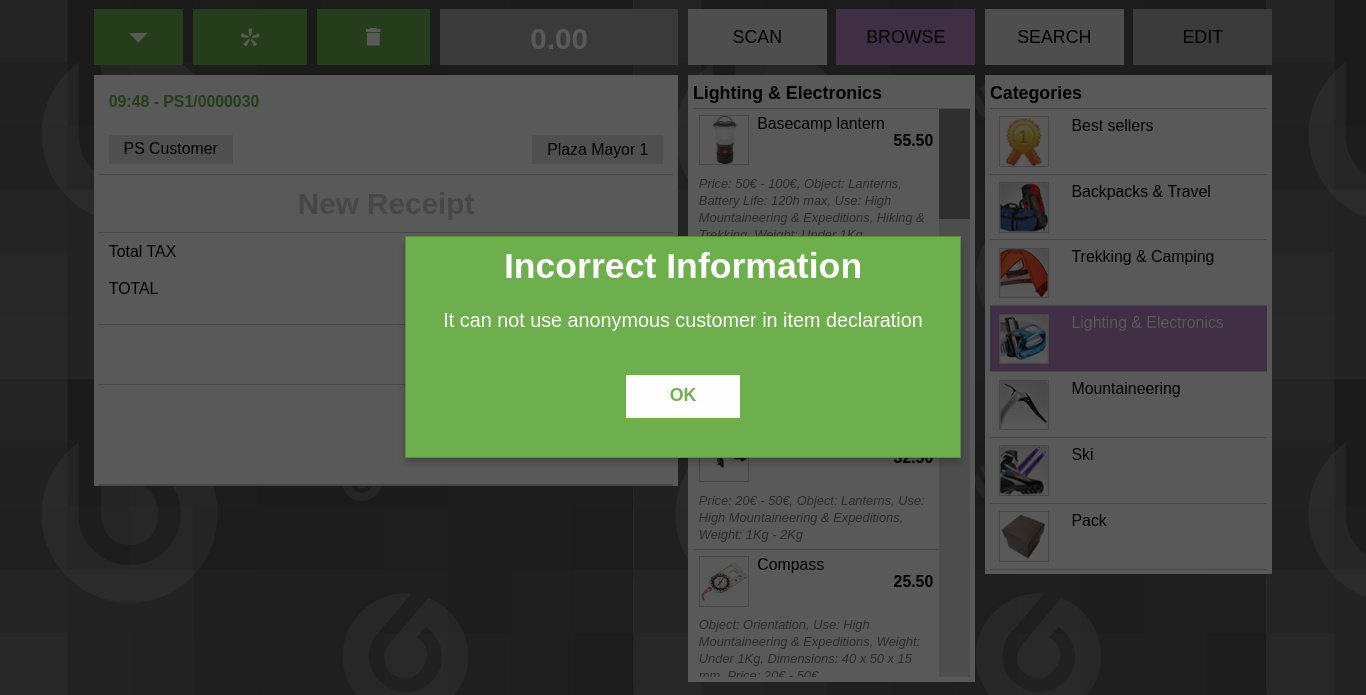 | Steps To Reproduce | PRECONDITIONS: "Contact customer info for product" module and its "WEB POS Show BusinessPartner Birth Information" preference need to be installed and configured, respectively. For more information, check the CIPa010-030 test cases from Testlink: [CIPa010] https://testlink.openbravo.com/testlink/linkto.php?tprojectPrefix=Communit&item=testcase&id=Communit-10882 [^] [^] [CIPa020] https://testlink.openbravo.com/testlink/linkto.php?tprojectPrefix=Communit&item=testcase&id=Communit-10883 [^] [^] [CIPa030] https://testlink.openbravo.com/testlink/linkto.php?tprojectPrefix=Communit&item=testcase&id=Communit-10884 [^] [^] 0. Log in to the Web POS as vallblanca 1. Search and select the "Avalanche transceiver" product from the "BROWSE" or "SEARCH" tabs. The "Item Declaration" popup will show 2. Select the anonymous customer ("VBS Customer" or "PS Customer"), and click "Apply". The "Incorrect Information" popup will show 3. NOTICE: the message isn't correct | |||||||||||