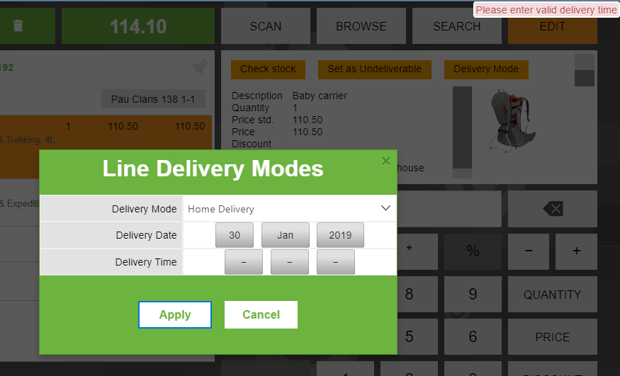 | Description | Delivery mode "Home Delivery" ask the cashier for a Date and Time for the delivery. The time is mandatory in hours and minutes. How should the cashier at the moment of the creation of the ticket know the delivery time? | |||||||||||