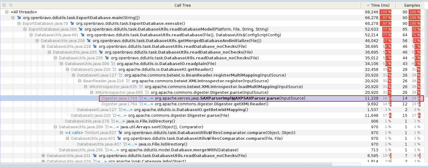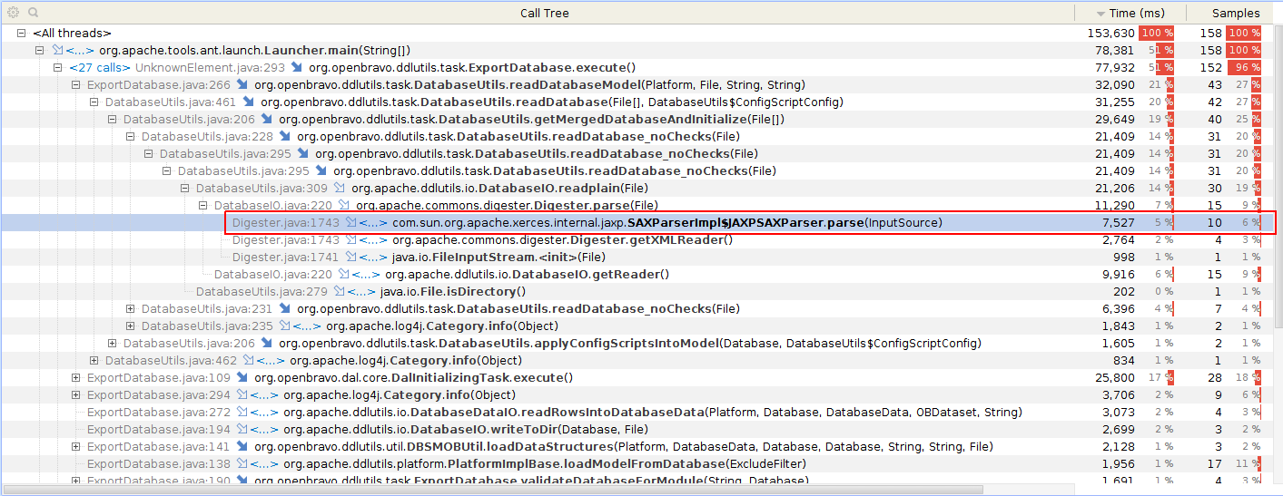 | Description | The fix for issue 0040047 set the export.database as a forked task. After introducing this change this task has become slower. This is caused because now a different XML parser is used for reading the XML files that define the database model. (See attached images of the export.database profiling before and after the fix). Note that the current XML parser factory implementation is org.apache.xerces.jaxp.SAXParserFactoryImpl which is present in the classpath because of the xercesImpl.jar[1] [1] https://code.openbravo.com/erp/devel/pi/file/tip/lib/runtime/xercesImpl.jar [^] | |||||||