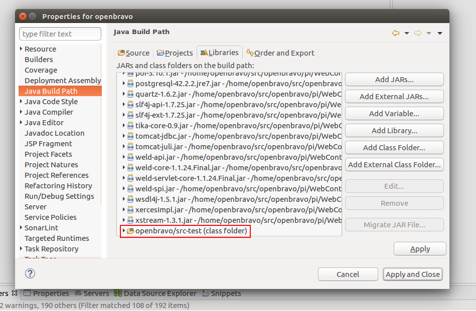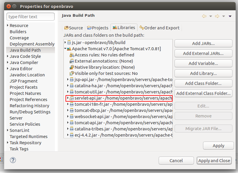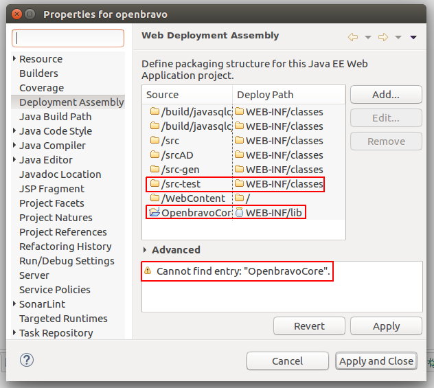| Description | The Openbravo Eclipse project requires some improvements: - Instead of importing the servlet api using the Tomcat 7 server, the servlet-api library can be directly included in the classpath. This applies both for the openbravo and OpenbravoTest projects. (See attached tomcat-servlet-api.png). - The "Deployment Assembly" (See attached deployment-assembly.png) of the openbravo project contains a wrong reference to OpenbravoCore. It also references the classes of the OpenbravoTest project that causes the src-test folder to be unnecessarily deployed as a "classes folder" in the "Web App Libraries" section. (See attached src-test-web-app-lib.png). - openbravo project depends on OpenbravoTrl and OpenbravoWad. It should depend just in OpenbravoCore project. (See attached required-projects.png) | |||||||